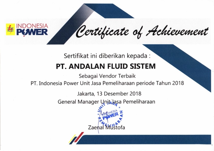 On 2018, PT Andalan Fluid sistem had achievement from PT Indonesia Power, as the best vendor specially
